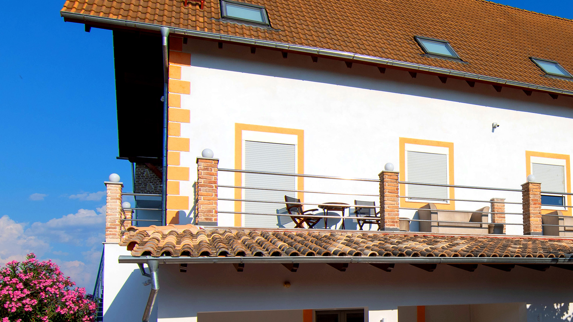 Die Wohnküche verfügt über einen direkten Zugang zum Westbalkon mit Blick in unseren Säulengarten und den über der Straße liegenden Olivenhain. Genießen Sie die Abendsonne bei einem Gläschen Wein!