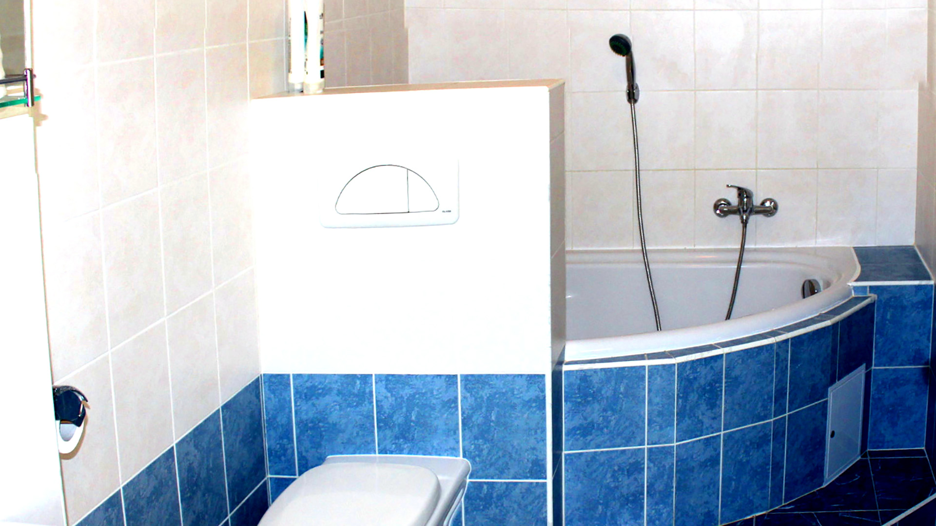 Das Schlafzimmer ist ebenso wie die Wohnküche klimatisiert. Das Badezimmer mit Eckduschbadewanne, WC und Handtuchheizung lädt zum Erfrischen ein.