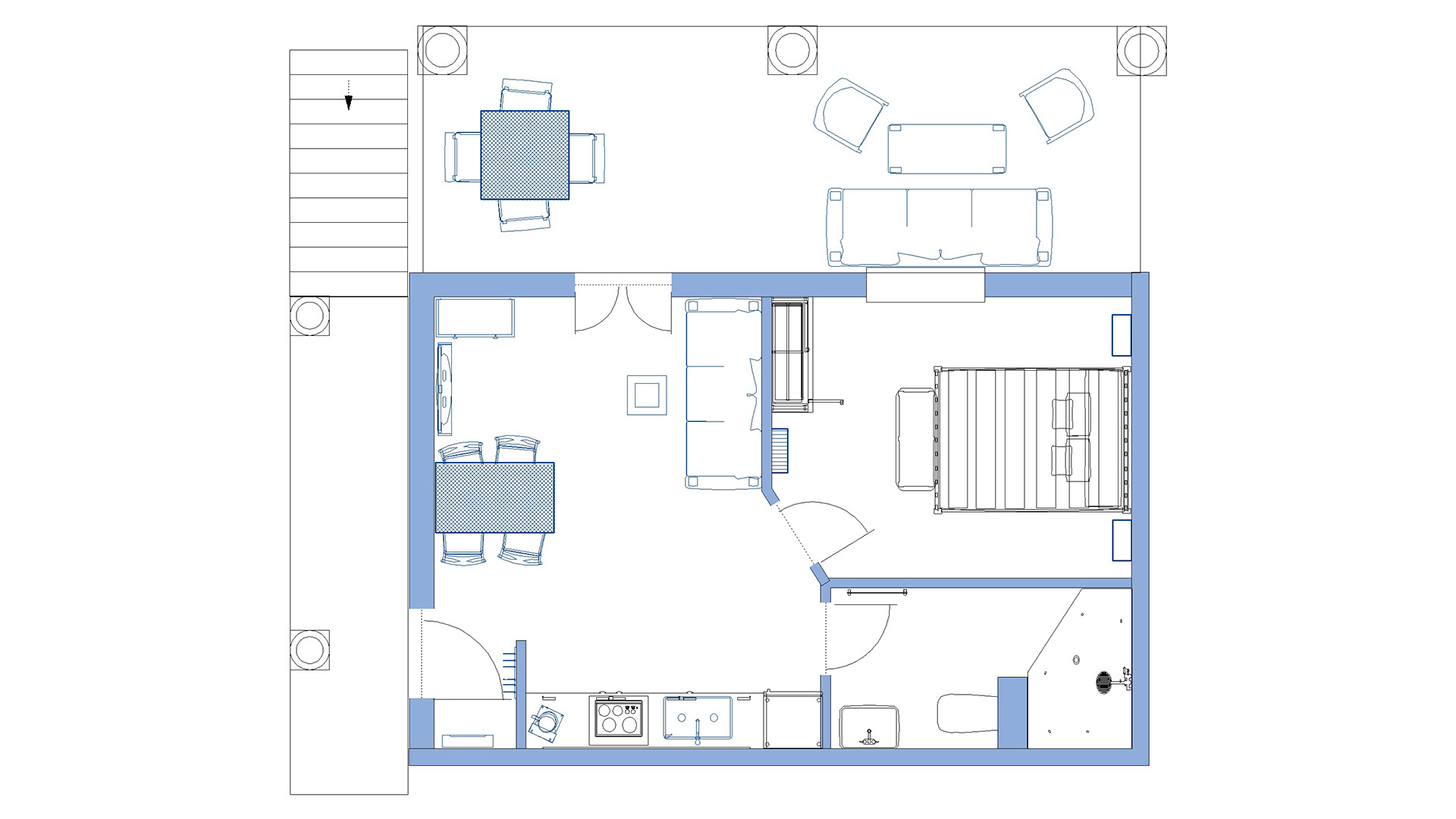 1 Schlafzimmer mit Doppelbett | 1 Schlafcouch | 1 Bad | Wohnküche | Ost Terrasse