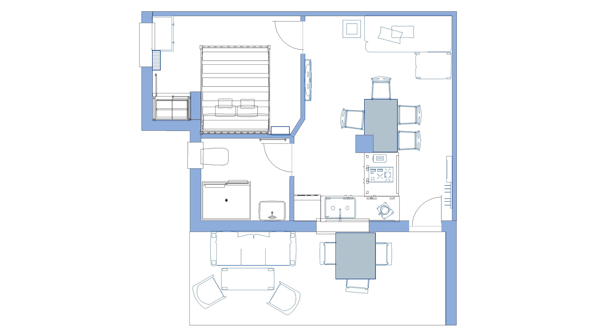 Das Schlafzimmer ist ebenso wie die Wohnküche klimatisiert. Das Badezimmer mit begehbarer Regendusche, WC und Handtuchheizung lädt zum Erfrischen ein.