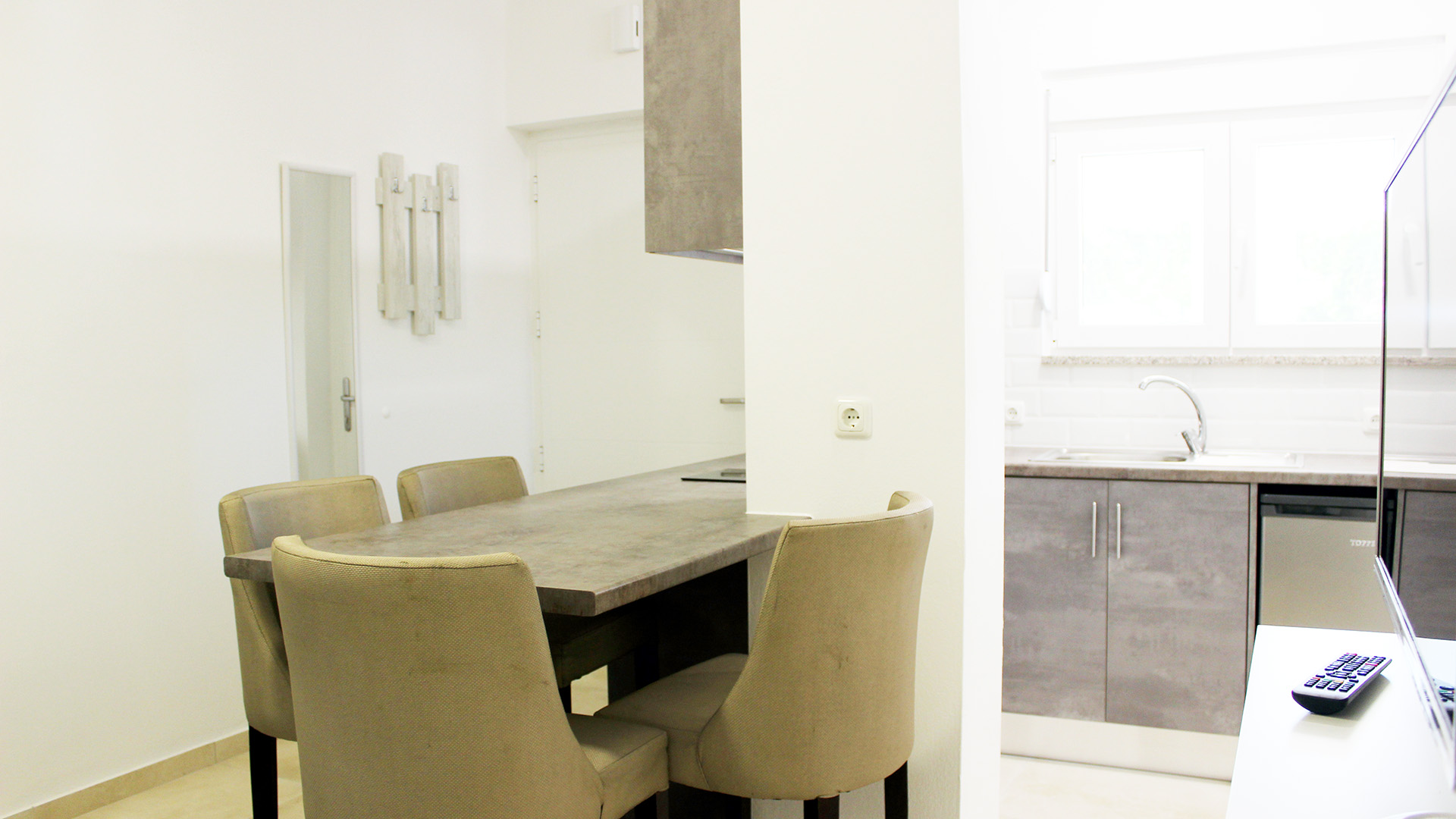 Der Wohnbereich mit Esstisch für bis zu vier Personen, sowie die Schlafcouch und Smart TV laden zum Entspannen ein. Die komplett ausgestattete Küche bietet Ihnen alles, was Sie für schöne gemeinsame Kochabende brauchen.